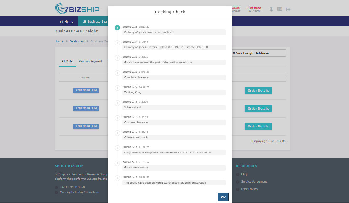 BizShip is an all-in-one platform that allows you to pay, and track your shipments along the logistics chain. You will receive notifications on every step along the way and keep you updated on all statuses, making sure that you have the latest info at all times.
